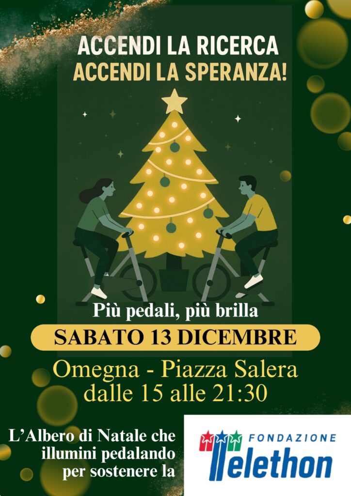 Quest’anno per rafforzare un’ulteriore azione di promozione nei riguardi della ricerca medica della Fondazione Telethon, sempre da parte degli amici della Sezione Uildm di Omegna, è stato approntato un secondo banchetto FONDAZIONE TELETHON accanto all’Albero di Natale che quest’anno ha una particolare caratteristica: le luci si accendono grazie alla forza motoria prodotta col pedalare su alcune biciclette.